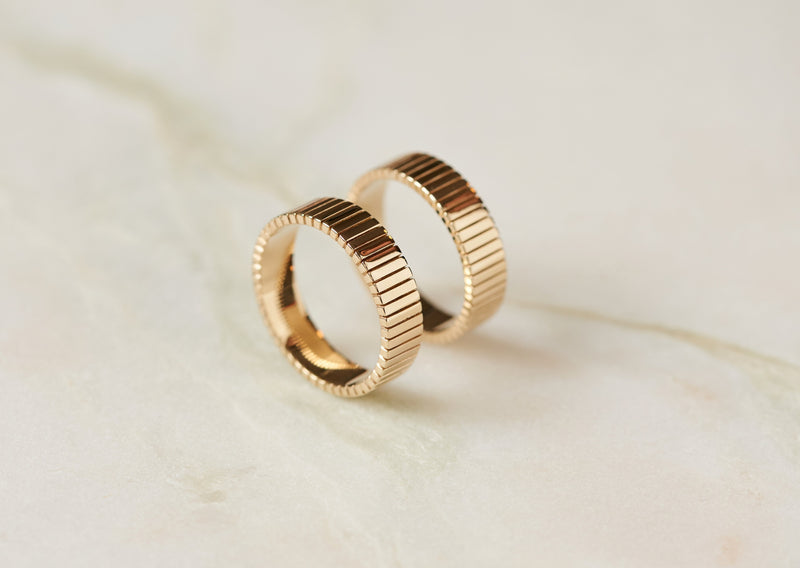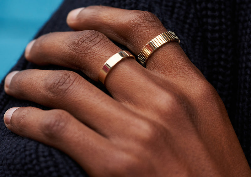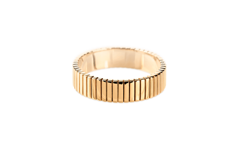 For those seeking a bold ring, this striking thick gold band is designed to be universally worn, exuding confidence and style. Adorned with an etched pattern, the ring possesses a strong and edgy aesthetic.