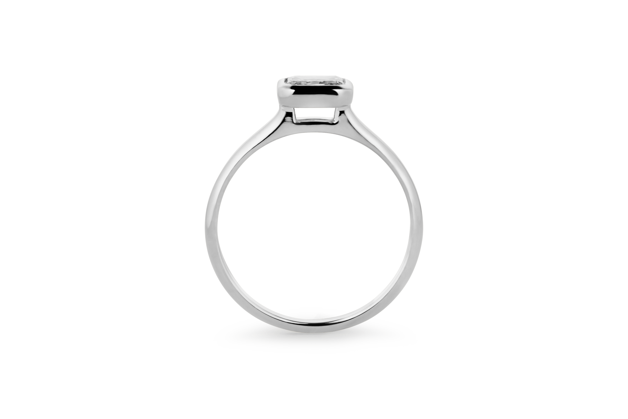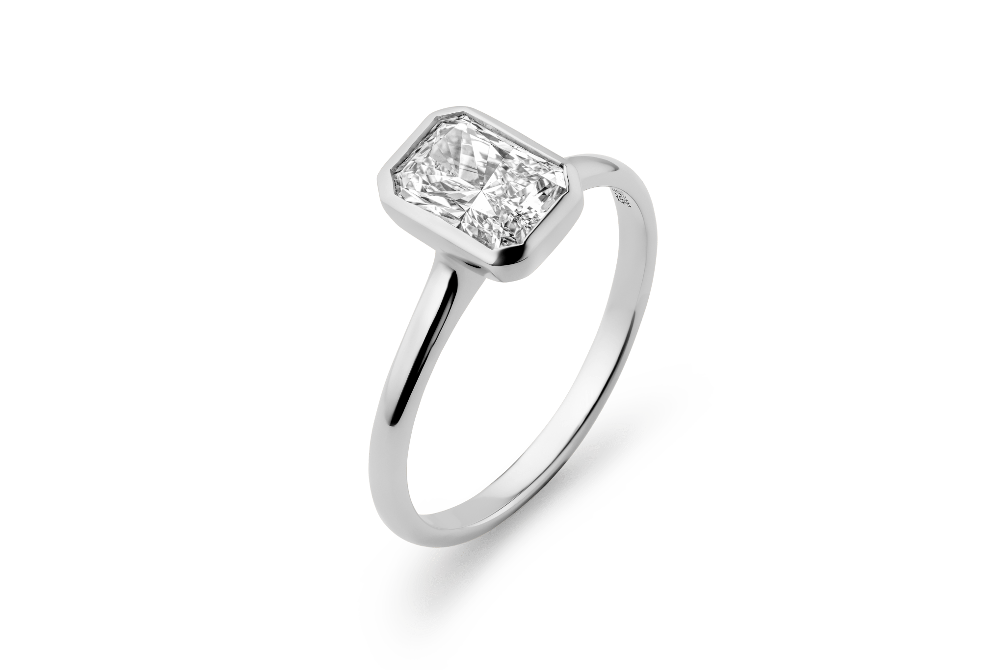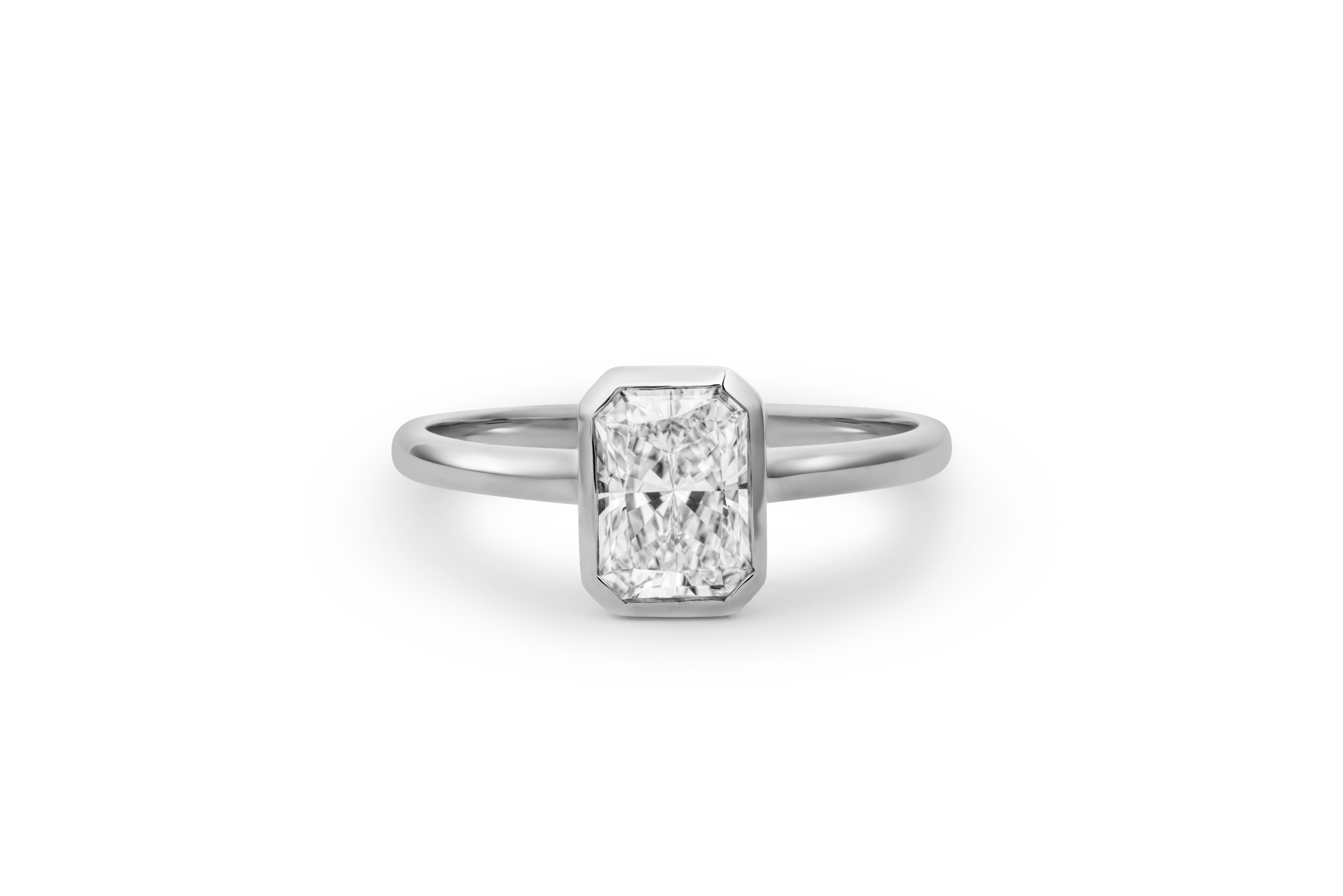 Eine frische Interpretation eines klassischen Verlobungsrings, dieses Design präsentiert einen im Labor gezüchteten Diamanten im Radiant-Schliff, der von einer eleganten Zargeneinfassung umfasst wird. Erhältlich in drei Karatgrößen, ist es ein zeitloses, elegantes Schmuckstück.