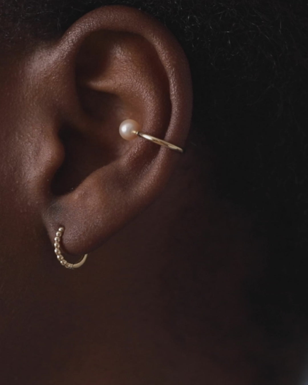Eleganz in ihrer reinsten Form: Der Single Pearl Ear Cuff setzt mit seiner schlanken Goldsilhouette und einer exquisiten japanischen Akoya-Perle, die innen am Ohr sitzt, ein dezentes, aber eindrucksvolles Zeichen. Dieser Ohrschmuck vereint Simplizität mit Einzigartigkeit und bereichert deine Ohrschmuck-Kollektion um ein frisches Highlight.