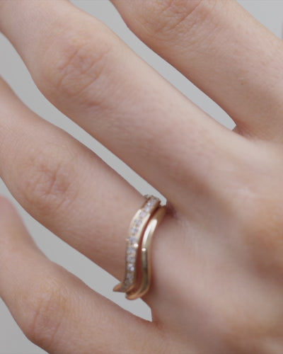 Dieser Ring zeichnet sich durch ein sanft konturiertes Band aus, das mit Brillantschliff-Labordiamanten besetzt ist. Die Kanalfassung bietet ein nahtloses Funkeln und behält dabei ein schlankes Profil. Entworfen, um perfekt mit unserem Curved Pear Diamond Ring und Curved Gold Band zu harmonieren und einen beeindruckenden Stapel zu kreieren – oder steht wunderschön für sich allein.