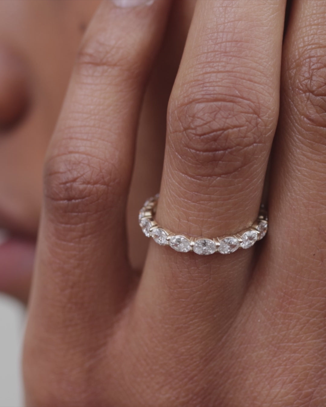 Dieser faszinierende Ring präsentiert Oval-Diamanten im Ost-West-Set in einem kontinuierlichen Eternity-Design. Die einzigartige Ausrichtung verstärkt ihr Strahlen und macht ihn zu einem zeitlosen Klassiker – perfekt als Ehering, zum Jubiläum oder als auffälliges Statement für sich allein.