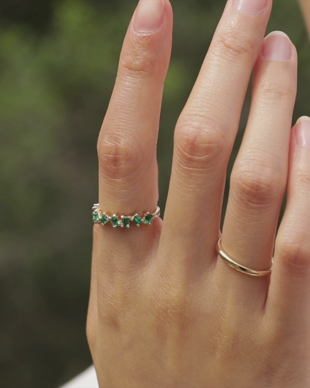Entdecke die ultimative Quelle für Komplimente für deinen Schmuck. Dieser von Art Deco inspirierte Ring verfügt über neun im Labor gezüchtete Emeralds, die in einem Zickzackmuster ausgerichtet sind und aus jedem Blickwinkel einen faszinierenden Schimmer in leuchtendem Grün erzeugen