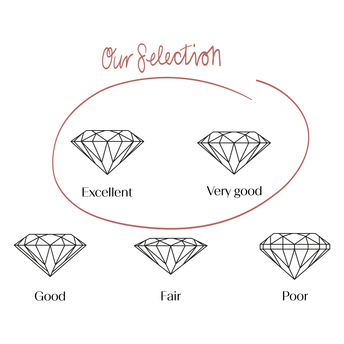 Der Schliff bezieht sich darauf, wie die Facetten eines Diamanten mit Licht interagieren. Mehr als jeder andere Faktor bestimmt der Schliff die Schönheit des Diamanten, da er bestimmt, wie stark er funkelt. Ist der Schliff schlecht, wirkt er trübe, auch wenn er eine hohe Farbe und Reinheit hat. Ein guter Schliff sorgt für maximale Helligkeit und Funkeln.
