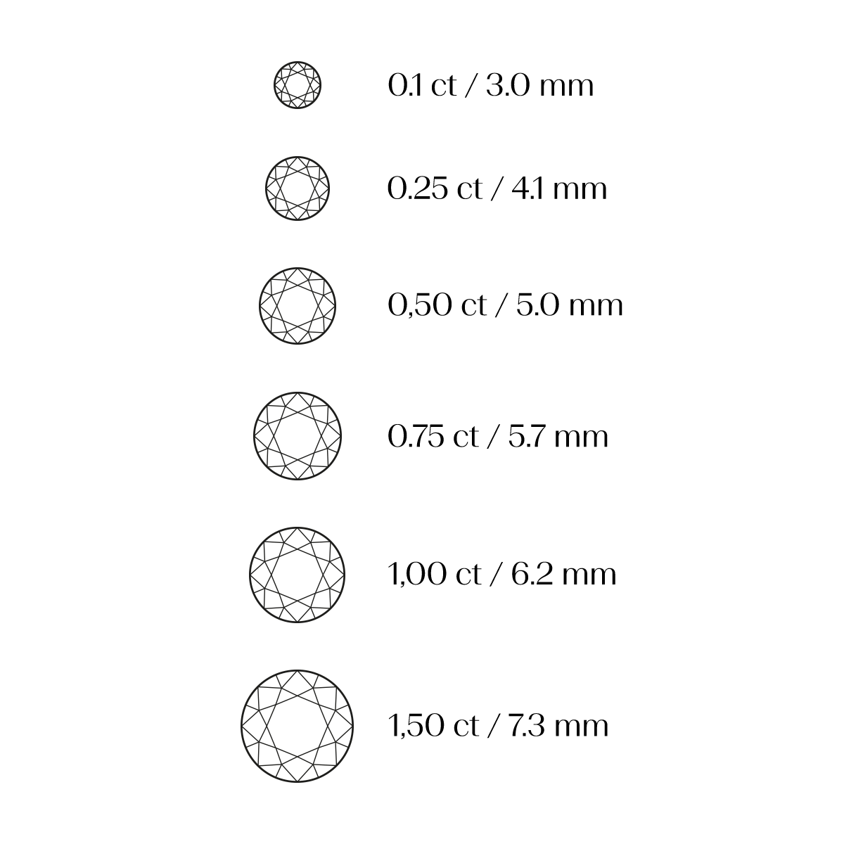 Karat beschreibt das Gewicht des Diamanten (ein Karat entspricht 0,20 Gramm). Zwei Diamanten mit demselben Karatgewicht können je nach Tiefe des Schliffs größer oder kleiner erscheinen. Wenn Reinheit, Farbe und Schliff berücksichtigt werden, gibt es große Preisunterschiede.