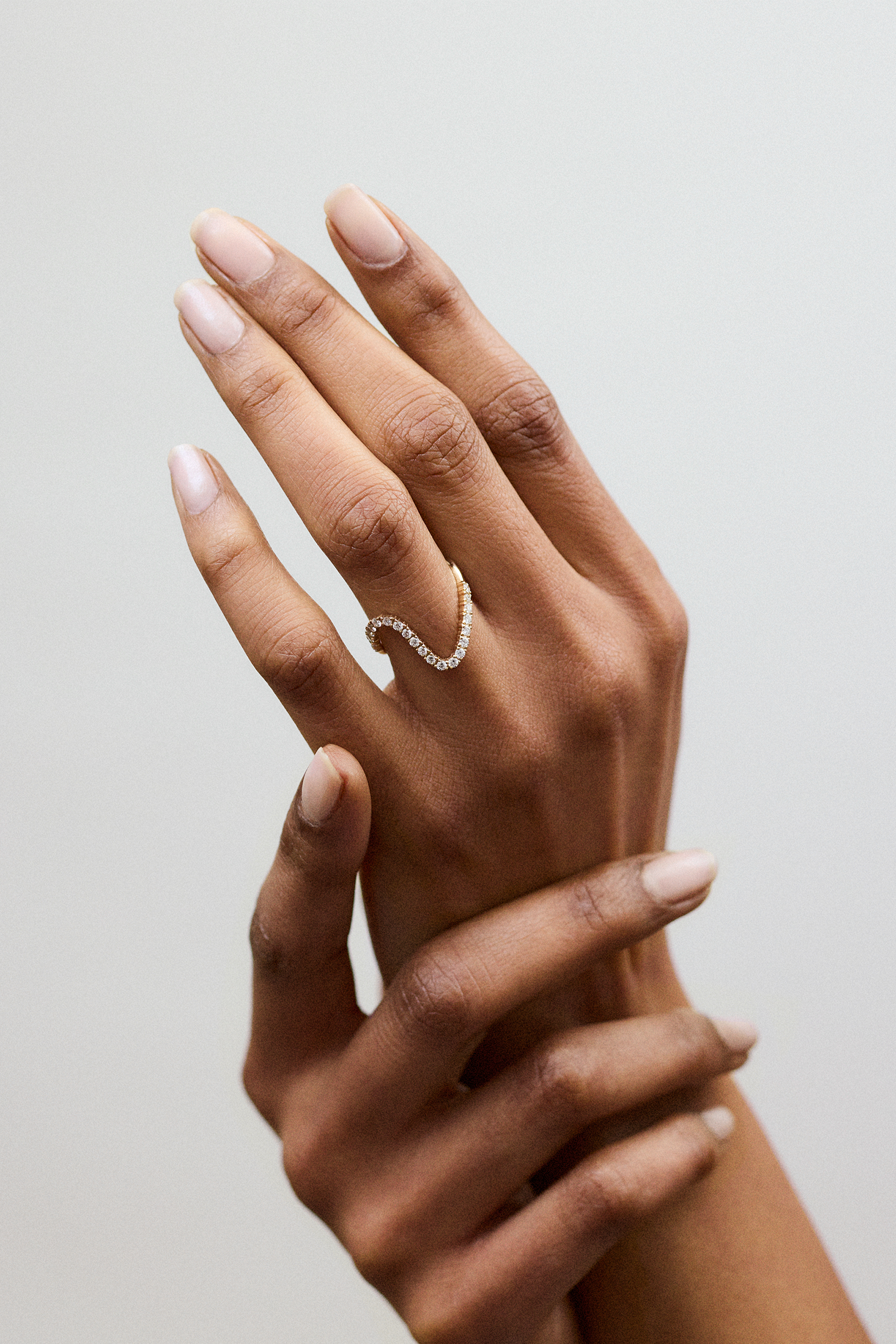 Anna stacks her Solitaire Emerald Ring with the Alliance Black Diamond Ring for a modern stack.